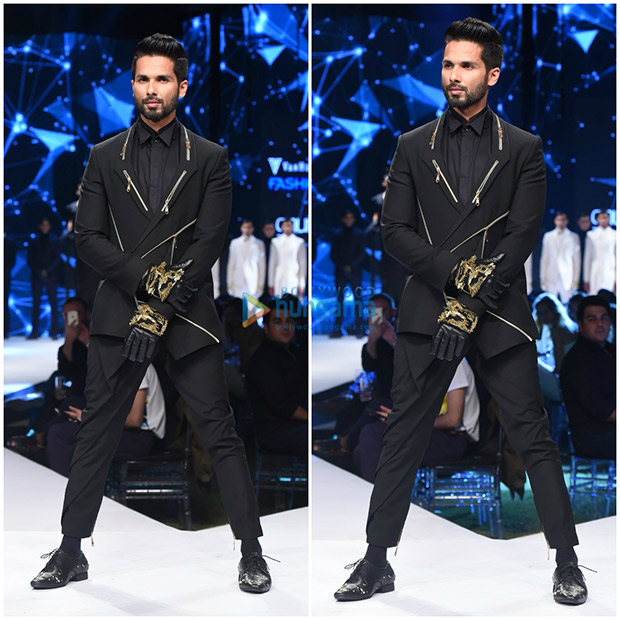 Before the hectic promotional schedule begins, Shahid Kapoor turned showstopper at the GQ Fashion Nights in collaboration with Van Heusen at Taj Lands End hotel in Bandra, Mumbai. Shahid walked the ramp for designer Gaurav Gupta looking sharp in an all-black outfit with silver work on the jacket and gloves.